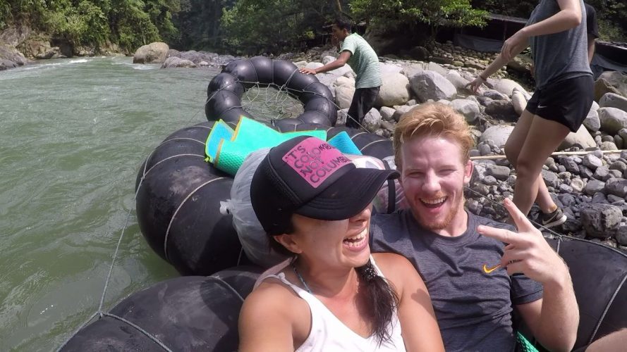 El siguiente día fue muy relajado. Se visitan unas cascadas pequeñas; bañito en el río, almuerzo y el desplazamiento de vuelta a Bukit Lawang es en un divertido medio de transporte hecho con neumáticos de llantas amarrados unos con otros y delante va el guía remando y esquivando piedras en los rápidos del río. A mi me encantó.